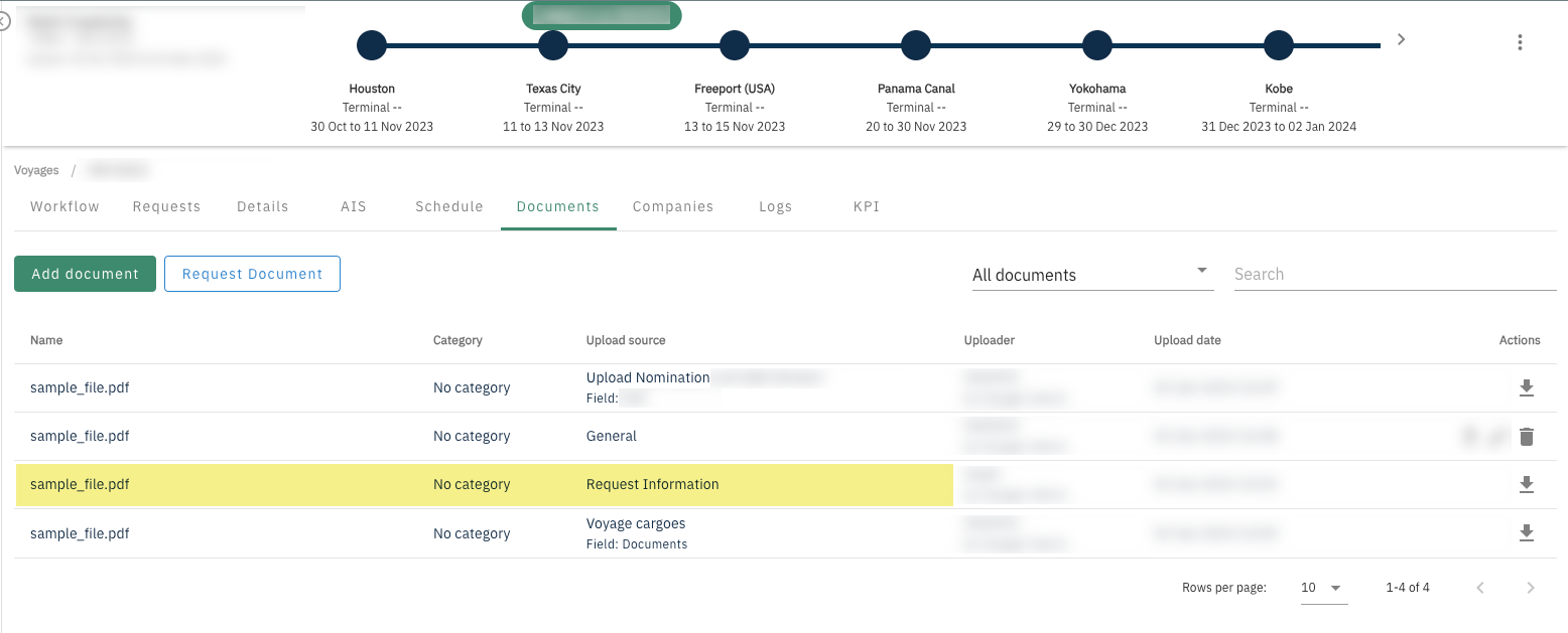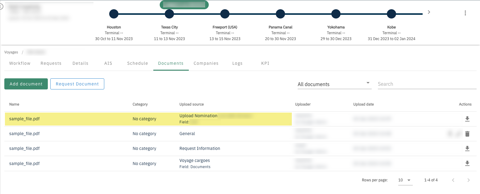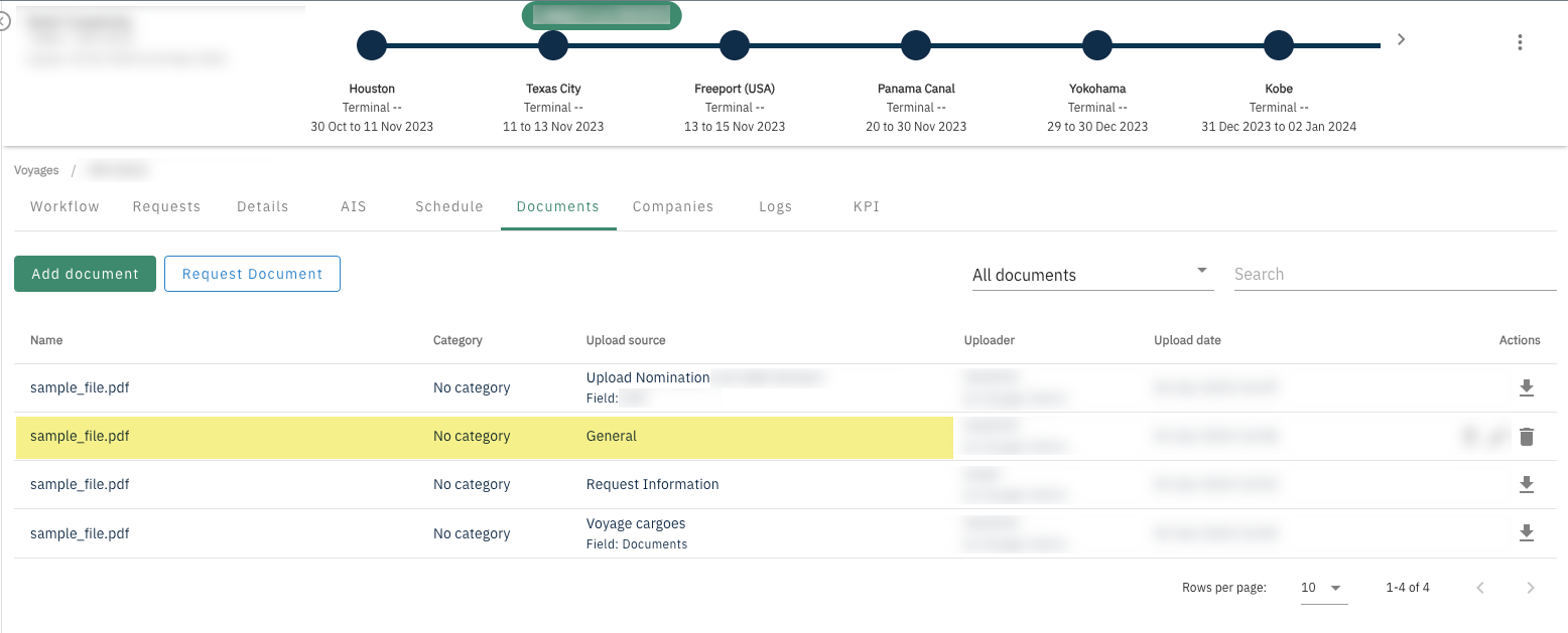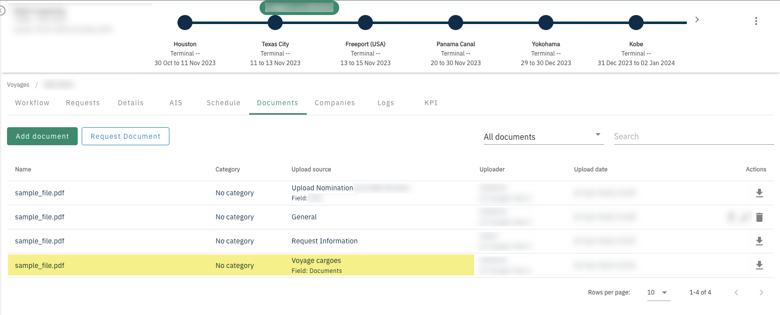 When a document is uploaded through the Cargo table (under Details tab), it will be flagged as Upload source: Voyage cargoes and the cargo table permissions will apply for the file visibility.