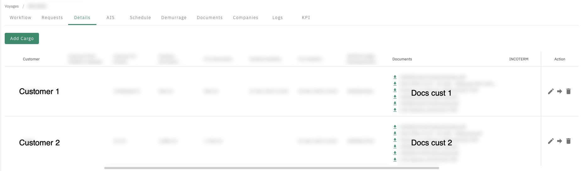 Each customer will only have visibility of the documents uploaded into their corresponding row of the cargo table.