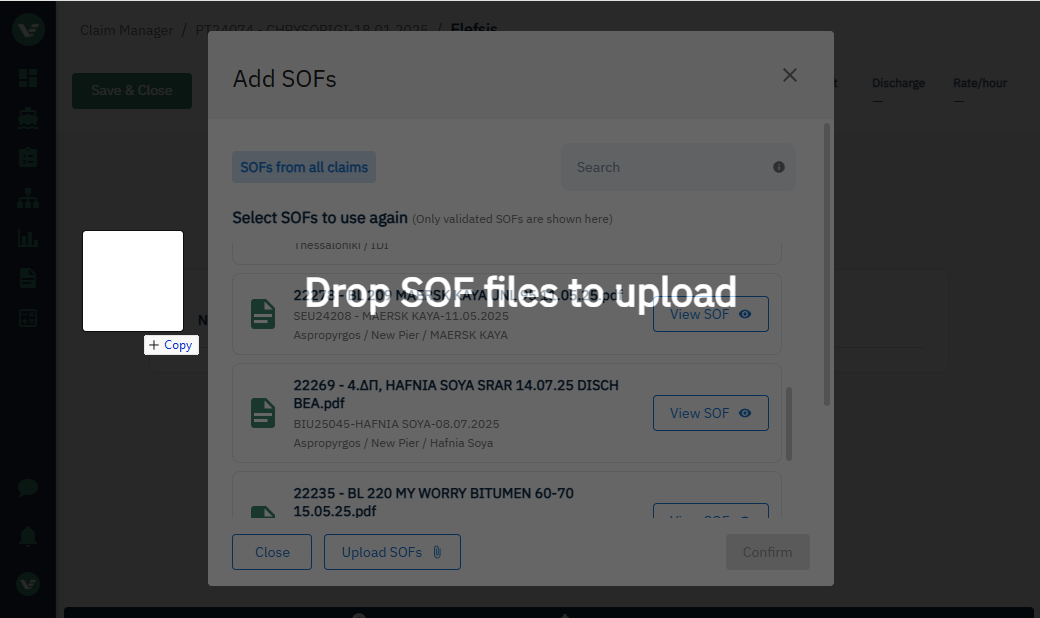 Drag and drop functionality has moved to the “Add SOFs” module within the portcall. The main portcall tab now only acts as the laytime calculator. If the portcall has no SOF, a window will automatically open to add one. Here you can drag and drop a PDF directly onto the screen.